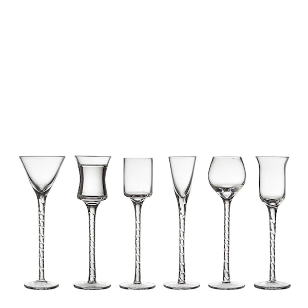 Skapa en härlig atmosfär runt bordet med våra sex unika snapsglas, vars stjälkar är konstfullt vridna för att bidra till en festlig stämning.