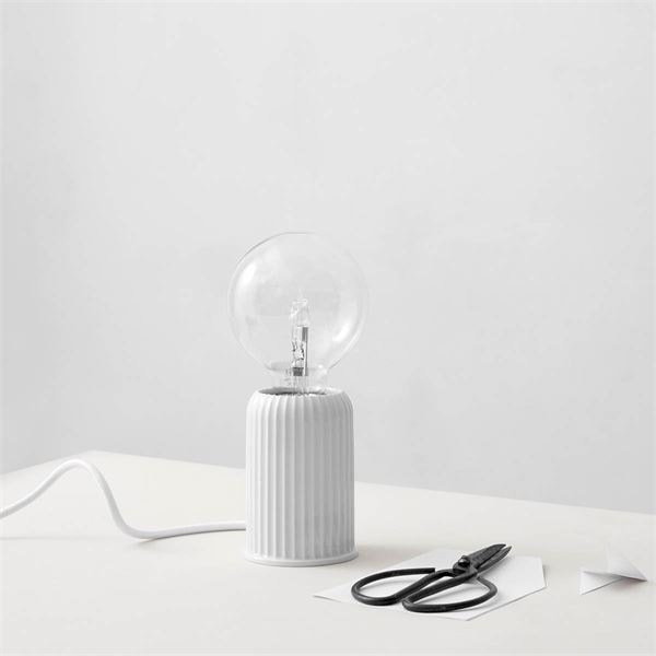Lyngby Fitting #03 är en stilren bordslampa i vitt porslin, designad av Philip Bro Ludvigsen för Lyngby Porcelæn. Formen har inspirerats av den klassiska Lyngby-vasen, med dess räfflade yta och rena linjer – ett uttryck som bär tydliga spår av Bauhaus-rörelsens funktionalistiska ideal.
