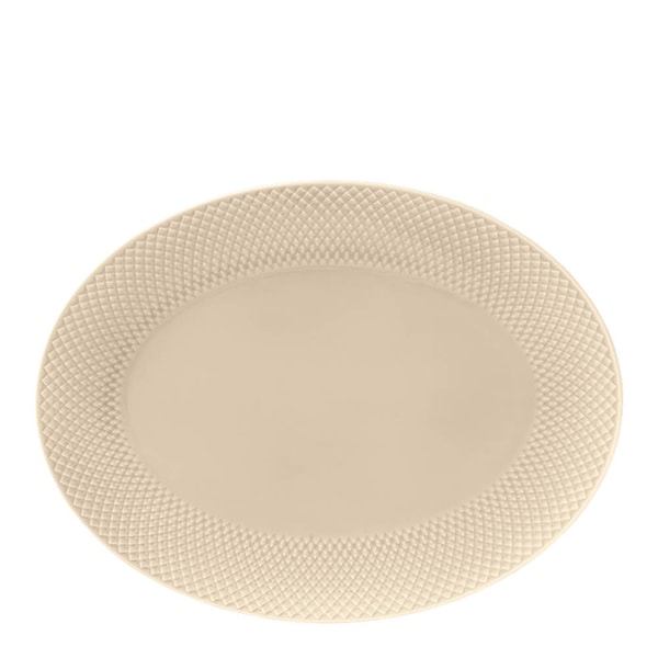 Fullända dukningen med det stora ovala serveringsfatet från Rhombe Earth-serien, 35x26,5 cm, i färgen marble från Lyngby Porcelæn. Den beige tonen lyfter fram mönstret i porslinet och skapar en varm och tidlös känsla.