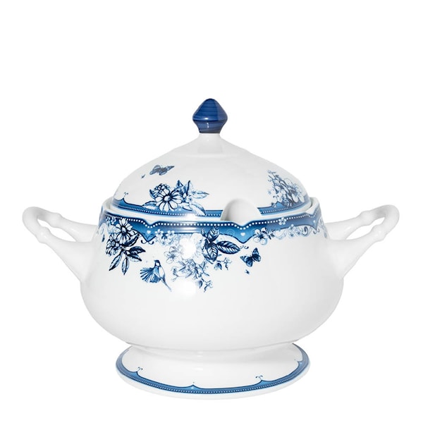 Magnor Fjord terrin 3,75 L blå är en generös terrin i porslin, designad av Knut & Kjartan för Magnor, som kombinerar funktion med ett tydligt konstnärligt uttryck. Den handmålade blå dekoren är skapad av designduon själva och ger varje exemplar en levande och personlig karaktär, samtidigt som den knyter an till seriens nordiska formspråk.