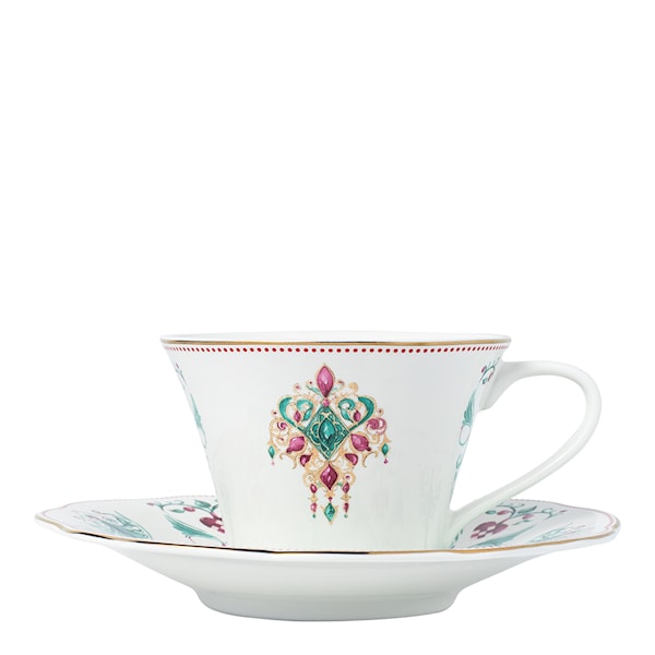 Denna kopp med fat är en del av Lucia-servisen i porslin med guldkant – sju klassiska delar som vid varsam hantering behåller sin glans och elegans.