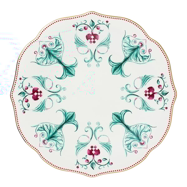Lucia tallrik 21 cm vit/röd/grön från Magnor är en stämningsfull kombination av tradition och modern design. Knut & Kjartan har hämtat inspiration från Luciadagens värme och ljus och tolkat det i en handmålad akvarelldekor. Mönstret bjuder på nostalgiska inslag och lek med ljusreflektioner, som en hyllning till det traditionstyngda dräktsilvret.