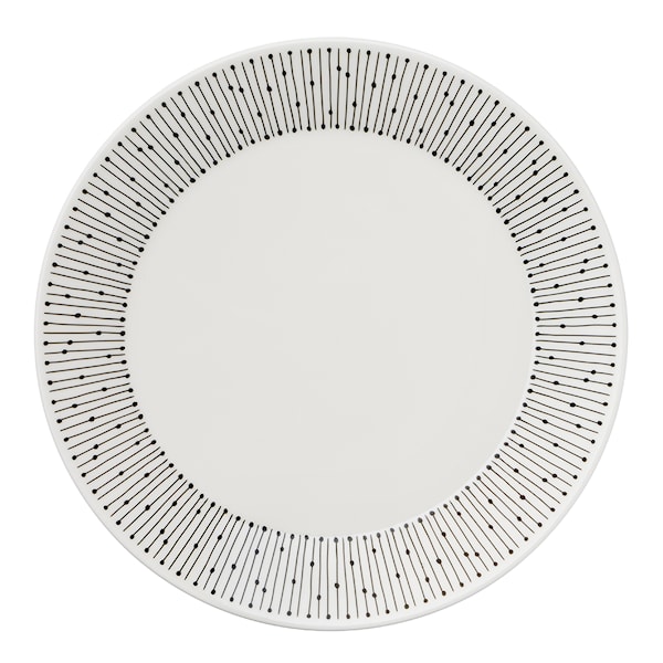 Tallrik på 19 cm från finska Arabia och deras serie Mainio Sarastus. Det grafiska mönstret runt kanten ger den ett distinkt utseende.