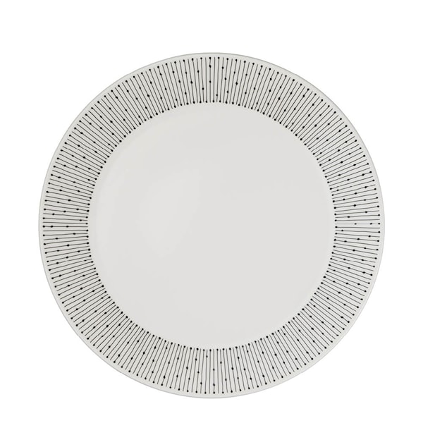 Tallrik på 25 cm från finska Arabia och deras serie Mainio Sarastus. Det grafiska mönstret runt kanten ger den ett distinkt utseende.