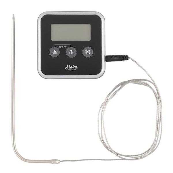 Med denna digitala stektermometer kan du enkelt säkerställa att kött, fisk och andra rätter tillagas till perfektion. Det breda mätområdet på 0–250 grader gör den mångsidig och användbar i allt från grillning till ugnsbakning. Den tydliga displayen visar temperaturen i realtid, och den inbyggda timern (00:01–99:59) hjälper dig att hålla koll på tillagningen.