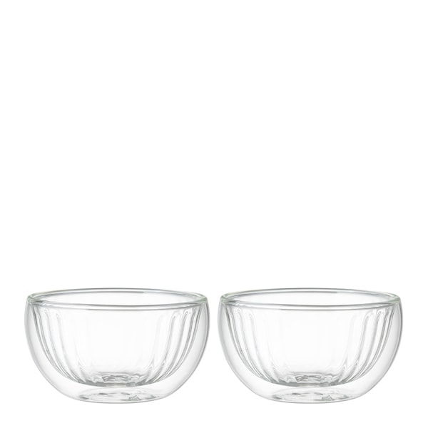 Maku Kitchen Life presenterar dessa eleganta dessertskålar i dubbelväggigt borosilikatglas. Den vackra räfflade ytan ger skålarna en tidlös charm, medan den isolerande konstruktionen ser till att innehållet håller rätt temperatur längre – utan att skålen blir för varm eller kall att hålla i.