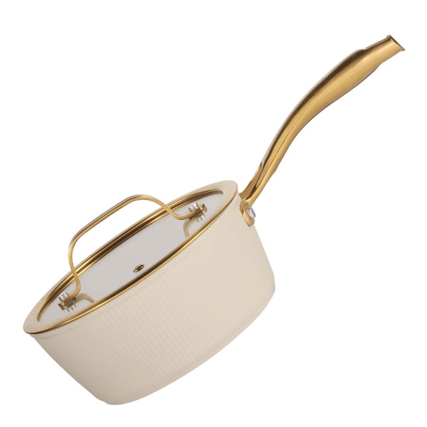 Det stilrena utförandet med räfflad utsida och guldfärgade detaljer gör kastrullen till ett lyxigt inslag i köket. Den fungerar på alla spisar, inklusive induktionshäll, och kommer med glaslock med ångventil. För bästa hållbarhet rekommenderas handdisk.