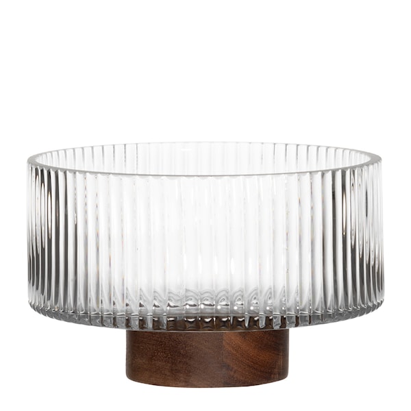 För dig som uppskattar både design och funktion är denna serveringsskål ett utmärkt val. Den räfflade glaskroppen ger ett dekorativt ljusspel, medan foten i varmtonat akaciaträ ger ett rustikt men elegant uttryck.