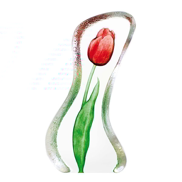 Denna vackra skulptur från Målerås är ett gjutet kristallblock i serien Floral Fantasy med ett sandblästrat och målat motiv av en tulpan. Skulpturen är målad med organiska färger, och den är handgjord i Målerås med signatur placerad i botten.