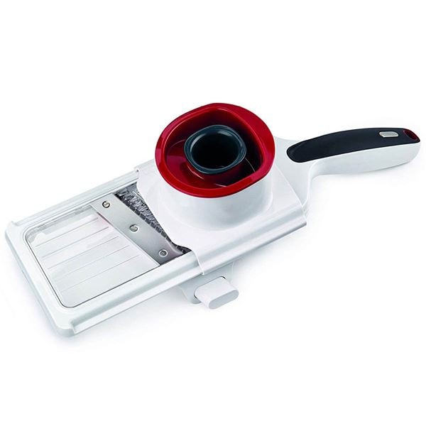 Den medföljande hållaren ser till att grönsaken hålls stadigt på plats, samtidigt som den skyddar fingrarna från att komma i kontakt med det vassa bladet i rostfritt stål. Mandolinen är 33 cm lång och tillverkad av slitstark plast i vitt, grått och rött.