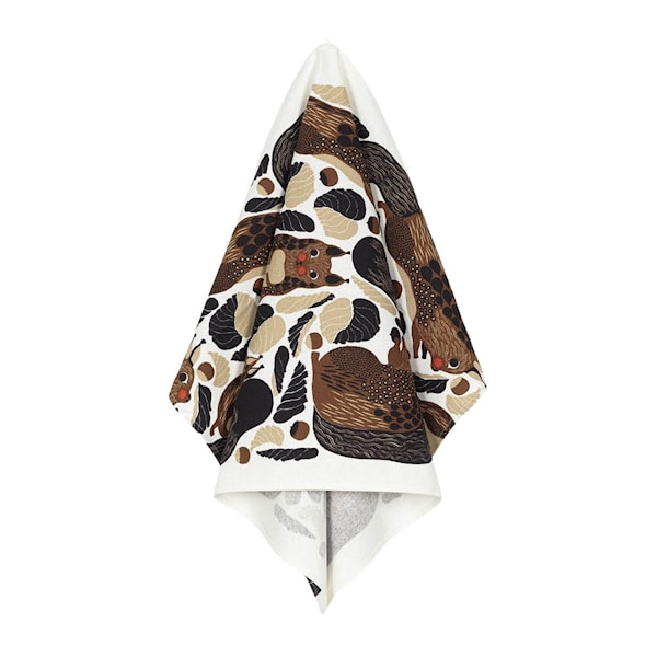Marimekko Kurre kökshandduk 43x70 cm i vit, brun och svart är en stilren kökshandduk med ett levande mönster. Kurre, som betyder ekorre, är designad av Aino-Maija Metsola och bygger på originalkonst målad med pensel och bläck, inspirerad av natur och barndomsminnen.