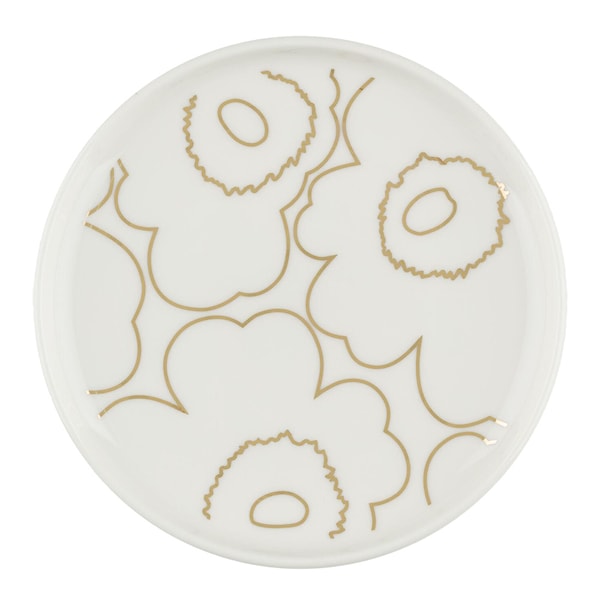 Oiva Piirto Unikko tallrik 13,5 cm vit/guld från Marimekko är en elegant liten tallrik tillverkad av vitt stengods med det distinkta Piirto Unikko-mönstret i guld. Eftersom tallriken har gyllene metalliska detaljer rekommenderas handdisk för att bevara mönstrets skönhet.