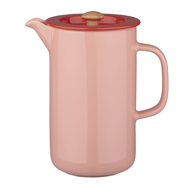 Oiva presskanna från Marimekko är en elegant och funktionell kaffebryggare som förenar keramiskt hantverk med tidlös design. Den är tillverkad av keramik med en laxröd glasyr på kannan och en tomatröd glasyr på locket, vilket ger ett varmt och inbjudande uttryck.