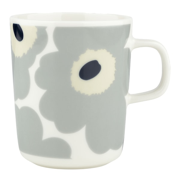 Oiva-muggen är gjord av vitt stengods som tål diskmaskin, ugn, mikrovågsugn och frys. Denna produkt firar 60-årsjubileet av Unikko-mönstret och den har jubileumsstämpeln på botten. Perfekt till både kaffe, te och varm choklad. Skapa din egen favoritkombination genom att mixa och matcha tillsammans med andra delar ur Marimekkos sortiment. Unikko (vallmo), som symboliserar kreativitet, föddes i en tid då knappt några blommönster ingick i Marimekkos kollektioner. Maija Isola var dock fascinerad av temat blommor och bestämde sig för att skapa en hel rad nya blommönster.