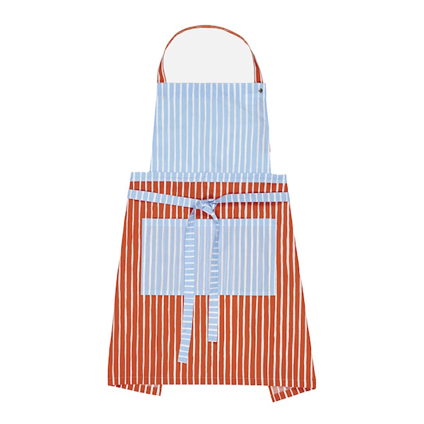 Piccolo förkläde från Marimekko är ett stilfullt och funktionellt tillskott till köket. Tillverkat av ekologisk bomull och tryckt i Helsingfors, pryds förklädet av det ikoniska Piccolo-mönstret i vitt, tomatrött och blått. Mönstret, designat av Vuokko Eskolin-Nurmesniemi 1953, kännetecknas av sina livliga, handmålade ränder som ger köket ett tidlöst uttryck.