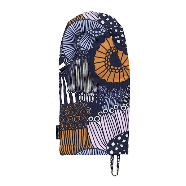 Pieni Siirtolapuutarha grytvante från Marimekko kombinerar funktionalitet med tidlös design. Tillverkad av slitstark bomull med en vadderad fyllning ger den bra värmeskydd vid hantering av heta grytor och ugnsformar. Fyllningen innehåller 50 % återvunnen polyester, vilket säkerställer en lätt och isolerande effekt. En praktisk hängögla gör det enkelt att hänga upp vanten på köket när den inte används.