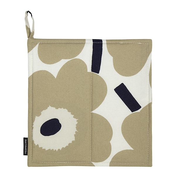 Pieni Unikko grytlapp från Marimekko är en praktisk och stilren detalj för köket, med måtten 21,5x21,5 cm och ett elegant mönster i vitt, beige och mörkblått. Grytlappen är tillverkad av bomull med en vadderad fyllning som ger gott skydd mot värme upp till 250°C. Den är också försedd med en praktisk hängögla för smidig förvaring.