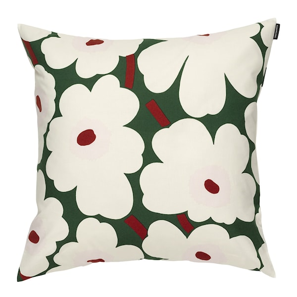 Pieni Unikko kuddfodral från Marimekko är en klassisk inredningsdetalj med ett fräscht och tidlöst uttryck. Tillverkat av bomull och tryckt i Helsingfors, pryds fodralet av det ikoniska Unikko-mönstret i en harmonisk kombination av mörkgrönt, rosa och vitt.