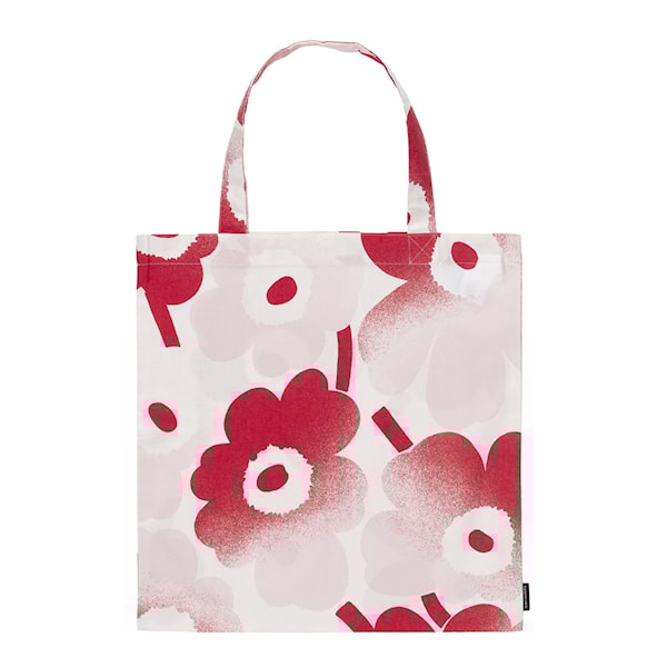 Pieni Unikko shoppingväska från Marimekko är en praktisk och stilfull tygkasse tillverkad av oblekt bomull. Med måtten 44x43 cm är den rymlig nog för dagliga ärenden, shopping eller som en extra väska i vardagen. Varje väska är unik, eftersom den sys av hela tygbredden, vilket skapar små variationer i mönsterplaceringen.