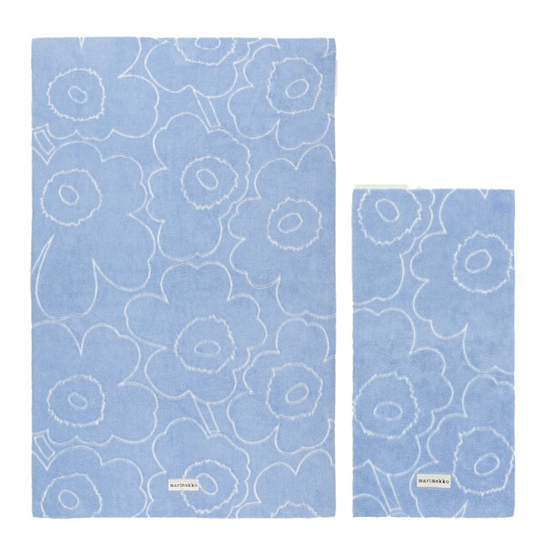 Piirto Unikko handdukset från Marimekko kombinerar funktionalitet med tidlös design. Setet består av ett badlakan på 100x160 cm och en handduk på 50x100 cm, båda tillverkade av mjuk och absorberande bomullsfrotté som ger optimal komfort och torkförmåga. Ena sidan av handdukarna pryds av det präglade Piirto Unikko-mönstret, vilket skapar en elegant struktur, medan Marimekko-logotypen pryder nederkanten.