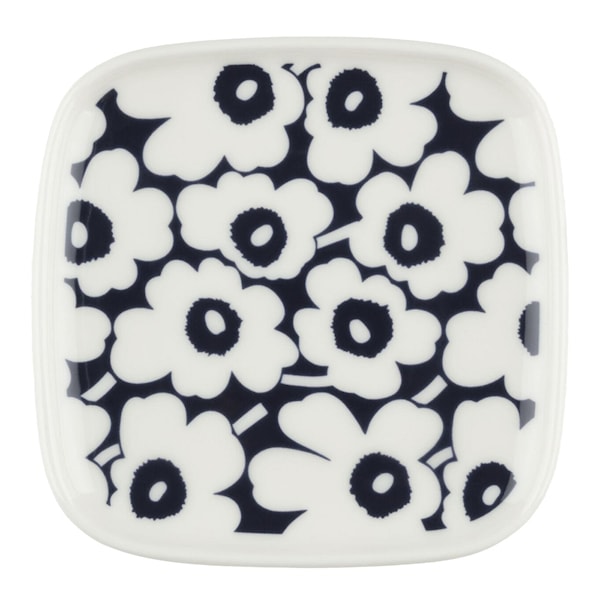 Pikkuinen Unikko assiett 10x10 cm fyrkantig i mörkblått och vitt från Marimekko är en charmig liten tallrik som bär det ikoniska Unikko-mönstret, skapat av Maija Isola 1964. Tillverkad av vitt stengods, är denna fyrkantiga Oiva-tallrik inte bara stilfull utan också mycket praktisk, då den tål diskmaskin, ugn, mikrovågsugn och frys. Innan användning bör du ta bort klistermärket från botten av produkten, då det innehåller en liten mängd metall.