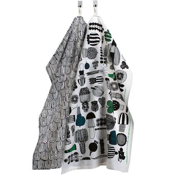 Detta set innehåller två kökshanddukar i en mjuk och slitstark blandning av bomull och linne. Med måtten 47 x 70 cm är de praktiska för både torkning och dukning. Varje handduk har ett unikt tryck: en med det livfulla Puutarhurin parhaat-motivet och en med det lugna, våginspirerade Vellamo-mönstret.