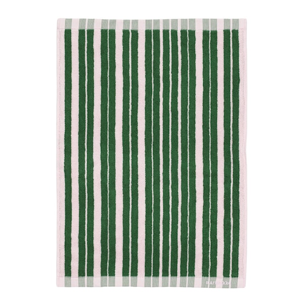 Raide-mönstret, med sina dynamiska ränder i grönt och rosa, tillför en lekfull men sofistikerad estetik till handduken. Marimekko, grundat 1951, är känt för sina ikoniska designer och höga kvalitet, och denna handduk är ett utmärkt exempel på deras förmåga att förena funktion och stil i vardagsprodukter.