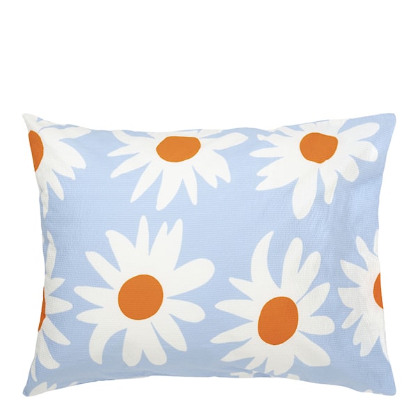 Mönstret Rakastaa, ei rakastaa designades av Maija Isola 1972 och är inspirerat av den klassiska kärleksleken "älskar mig, älskar mig inte". De lekfulla blommorna i blått, vitt och orange skapar en somrig lätthet och ger örngottet ett fräscht uttryck i sovrummet.