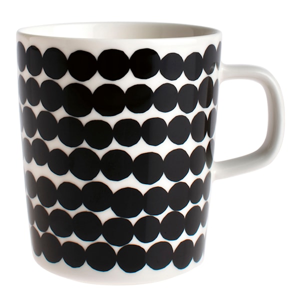Mugg med öra från Marimekko som ingår i Marimekkos serie Siirtolapuutarha. Det lekfulla mönstret är formgivet av Sami Ruotsalainen och heter Räsymatto, vilket betyder trasmatta på finska. Muggen är tillverkad av stengods och tål diskmaskin, mikrovågsugn och frys.