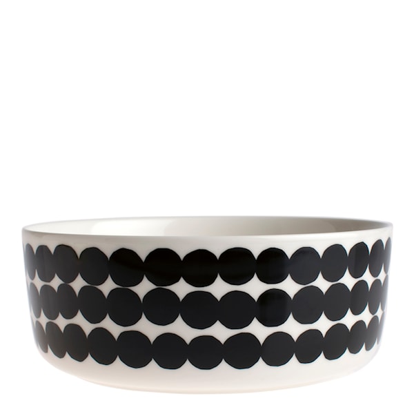 Skål från Marimekko som ingår i Marimekkos serie Siirtolapuutarha. Det lekfulla mönstret är formgivet av Sami Ruotsalainen och heter Räsymatto, vilket betyder trasmatta på finska. Skålen är tillverkad av stengods och tål diskmaskin, mikrovågsugn och frys.