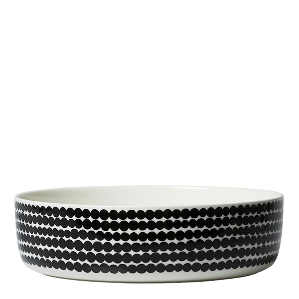 Stor skål från Marimekko som ingår i Marimekkos serie Siirtolapuutarha. Skålen passar perfekt till sallad, snacks eller frukt. Det lekfulla mönstret är formgivet av Sami Ruotsalainen och heter Räsymatto, vilket betyder trasmatta på finska. Skålen är tillverkad av stengods och tål diskmaskin, mikrovågsugn och frys.