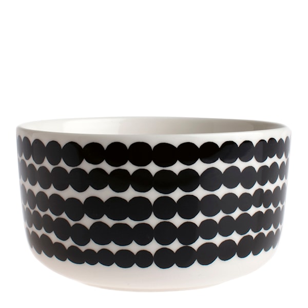 Skål från Marimekko som ingår i Marimekkos serie Siirtolapuutarha. Det lekfulla mönstret är formgivet av Sami Ruotsalainen och heter Räsymatto, vilket betyder trasmatta på finska. Skålen är tillverkad av stengods och tål diskmaskin, mikrovågsugn och frys.