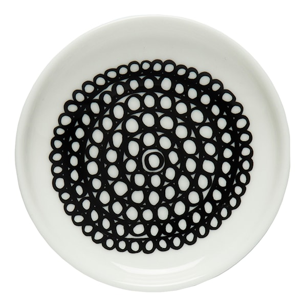 Liten flat tallrik från Marimekko som ingår i Marimekkos serie Siirtolapuutarha. Det lekfulla mönstret är formgivet av Sami Ruotsalainen och heter Räsymatto, vilket betyder trasmatta på finska. Tallriken är tillverkad av stengods och tål diskmaskin, mikrovågsugn och frys.