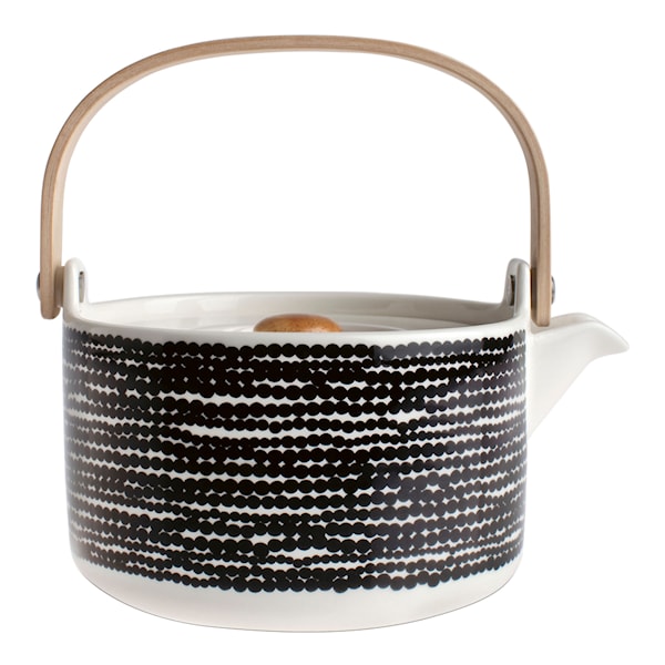 Tekanna med lock från Marimekko som ingår i Marimekkos serie Siirtolapuutarha. Det lekfulla mönstret är formgivet av Sami Ruotsalainen och heter Räsymatto, vilket betyder trasmatta på finska. Kannan är tillverkad av stengods och bör diskas för hand. Rymmer 70 cl.