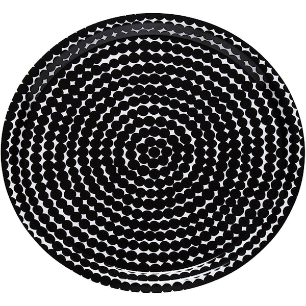 Denna runda bricka i laminerad björkkryssfaner har en diameter på 31 cm och pryds av Marimekkos klassiska Räsymatto-mönster i svart och vitt. Brickan är både lätt och slitstark – perfekt för servering av fika, frukost eller smårätter, samtidigt som den utgör en stilren detalj i köket eller vardagsrummet.