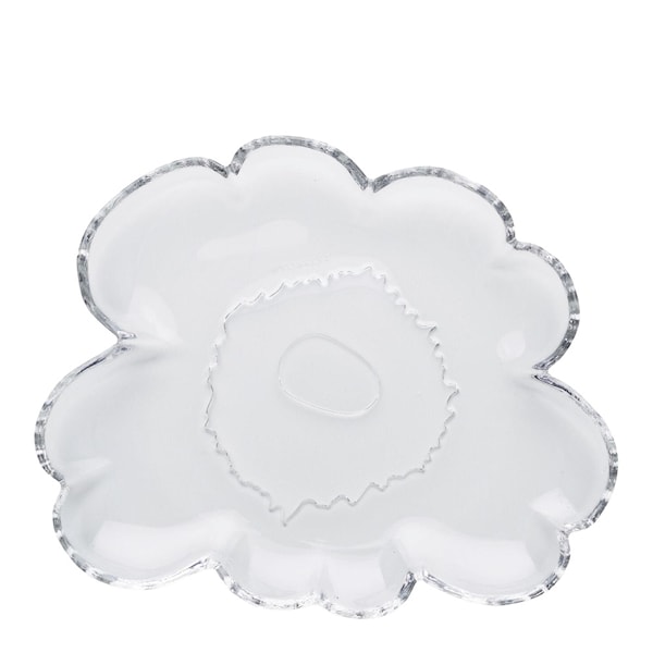 Unikko assiett 20 cm blomsterform klar från Marimekko är en elegant assiett tillverkad av glas, designad i den karakteristiska Unikko-blomsterformen.