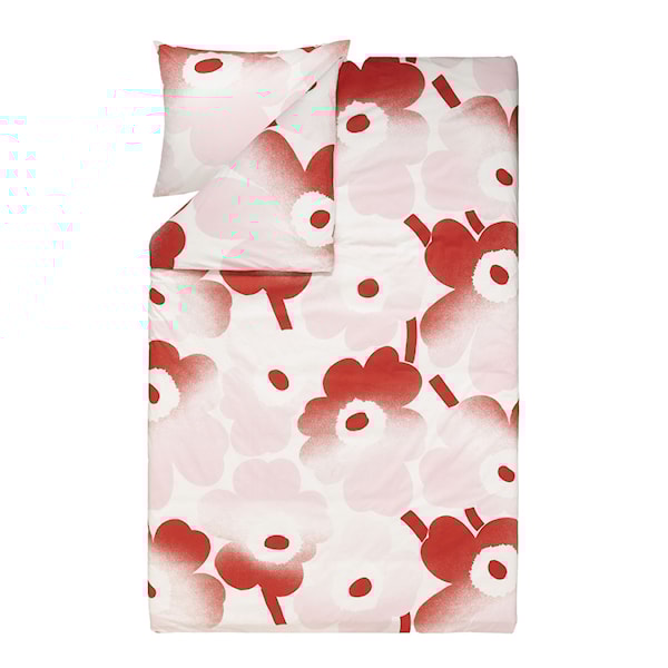 Unikko Häivähdys-mönstret, i en livlig rosa och röd färgpalett, är en modern tolkning av Marimekkos ikoniska blommotiv. Detta påslakanset tillför en stilfull och lekfull atmosfär till sovrummet. Marimekko, grundat 1951, är känt för sina karaktäristiska mönster och tidlösa kvalitetsprodukter som kombinerar konstnärligt uttryck med funktionell design.