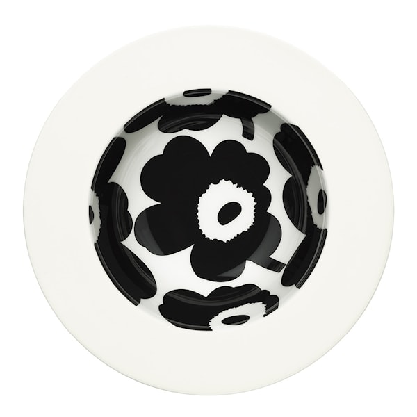 På insidan av assietten pryder det ikoniska Unikko-mönstret, designat av Maija Isola 1964. Detta tidlösa blommotiv, som i denna version presenteras i en klassisk färgkombination av vitt och svart, tillför en elegant och modern touch till dukningen.