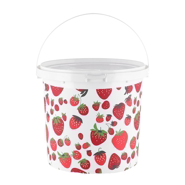 Marjukka plasthink med lock rymmer 5 liter och har en dekorativ jordgubbsdesign skapad av Anna Säteri. Perfekt för förvaring av sylt, pickles och andra livsmedel, tack vare det tättslutande locket som håller innehållet fräscht.