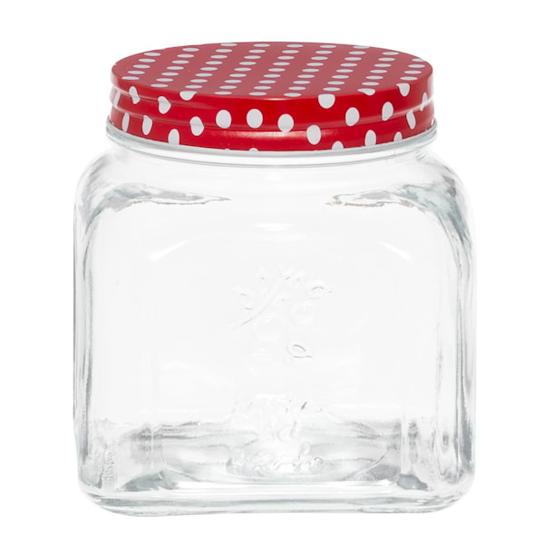 Marjukka konserveringsburk på 0,9 liter är både praktisk och dekorativ. Den kvadratiska glasburken har ett charmigt prickmönstrat skruvlock i rött och vitt samt en präglad text "Frutos del huerto".