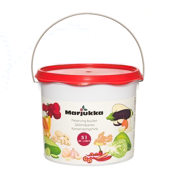 Marjukka inläggningshink på 5 liter är utformad för att underlätta konservering av livsmedel som inlagda grönsaker, syrade produkter och gravad fisk. Det lufttäta locket säkerställer en stabil konserveringsprocess, medan det perforerade innerlocket håller livsmedlen nedsänkta i vätskan, vilket är viktigt för optimal inläggning.