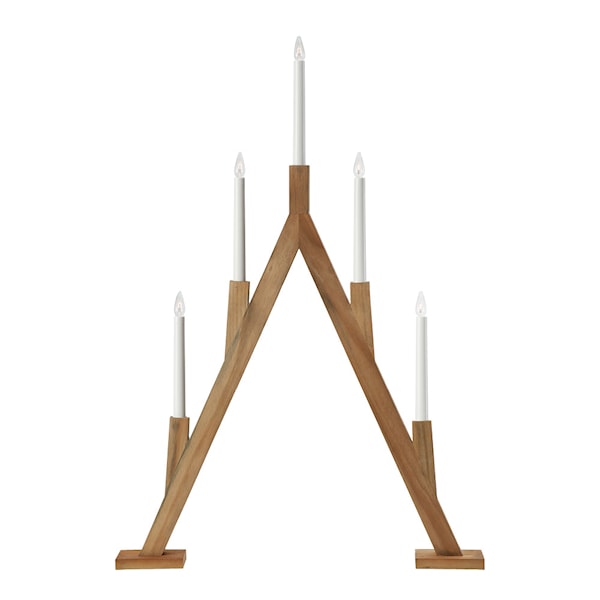 Bjurfors 5-armad adventsljusstake 76,5 cm från Markslöjd är en vacker kombination av klassisk elegans och modern design. Ljusstaken är tillverkad av betsat trä, vilket ger den ett naturligt och tidlöst utseende. De raka linjerna ger ett minimalistiskt intryck, medan de fem armarna med små lamphållare sprider ett varmt och inbjudande ljus i hemmet. Denna adventsljusstake passar lika bra i ett traditionellt julhem som i en mer modern inredning.