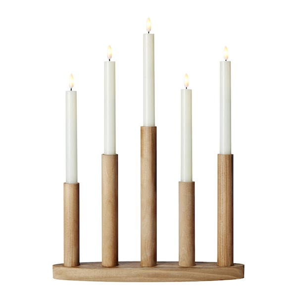 Milo trådlös adventsljusstake 5-armad från Markslöjd ger ditt hem en modern och stilfull känsla under adventstiden. Tillverkad av brunbetsat trä, sprider de fem batteridrivna LED-ljuskällorna ett varmt ljus som skapar en mysig atmosfär. Ljuskällorna är placerade i olika höjder, vilket ger ljusstaken ett unikt och levande uttryck som skiljer sig från traditionella adventsljusstakar.