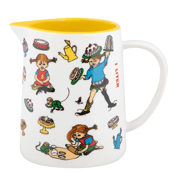 Upptäck glädjen och charm i köket med den underbara Pippi L bakar kannan från Martinex! Denna färgglada keramikkanna är dekorerad med Pippi Långstrump som steker pannkakor och bakar tårtor med Herr Nilsson, och har en solgul insida som sprider glädje varje gång du använder den. Med en volymkapacitet på 1 liter är denna kanna perfekt för att servera dina favoritdrycker med stil. Dessutom tål den ugn, mikrovågsugn och diskmaskin för enkel rengöring och användning.