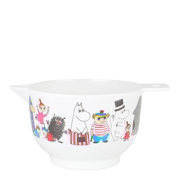 En bakskål i melamin för att baket eller matlagningen. Blanda smet och såser, vispa grädde och mycket mer med denna praktiska skål! Skålen har en hällpip och en gummiring i botten, så den står stadigt på plats. Längs skålens utsida löper en rad med välbekanta Muminfigurer i klara färger. Perfekt för dig med små hjälpredor hemma eller för dig som älskar Mumin.
