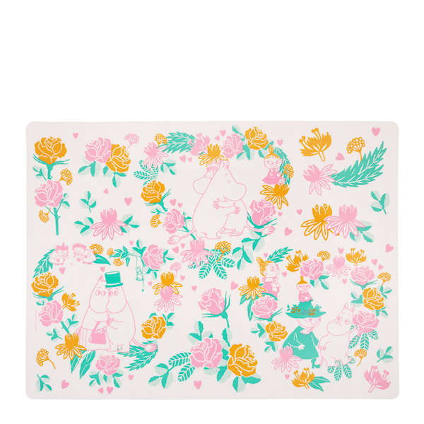 Mumin Bakmatta 45x35 cm från Martinex har ett kärleksfullt motiv med Mumin och hans vänner i rosa och gröna nyanser. Bakmattan kan även användas som pysselmatta.