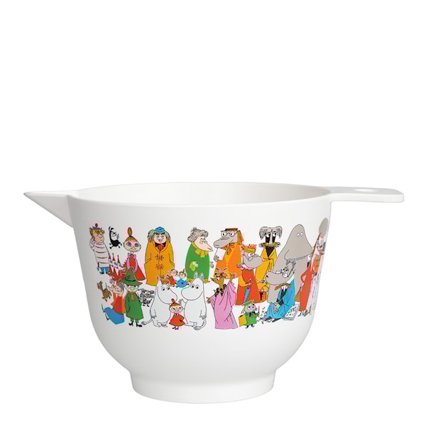 Gör bakningen ännu roligare med denna vita Mumin-bakskål på 1,5 liter. Med ett detaljerat mönster av Muminfigurer som njuter av varandras sällskap blir bunken en både dekorativ och funktionell del av köket.