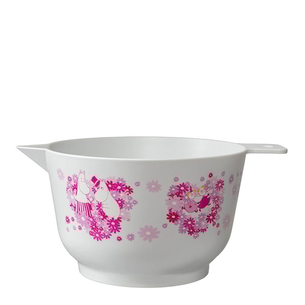 Martinex Mumin bakskål 3 L Blomsterhjärta är en slitstark och genomtänkt skål som passar både vardagsbak och större bakprojekt. Den rosa designen med Muminfigurer, blommor och hjärtan gör den till ett charmigt inslag i köket.