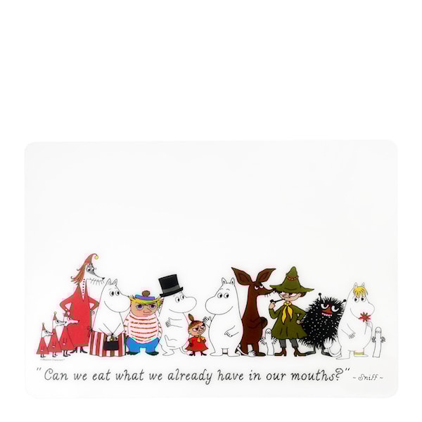 Skydda ditt bord med stil med den färgglada Mumin Bordstabletten från Martinex! Den genomskinliga bordstabletten i PP-plast är dekorerad med charmiga figurer från Mumindalen och ett kul citat av Sniff; "Kan vi äta det vi redan har i munnen?". Med en storlek på 43 x 30 cm är denna bordstablett perfekt för att ge din servering en extra touch av glädje och lekfullhet. Lägg till denna praktiska och charmiga bordstablett i din samling idag och låt Mumin sprida glädje vid varje måltid!
