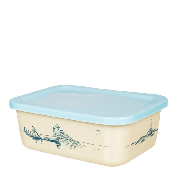 Mumin Horisont Lunchlåda M från Martinex är en praktisk matlåda tillverkad av återvunnen plast. Lunchlådan har en härlig beige färg med illustrationer av Mumin i mörkblått på sidorna, som ger den en charmig touch.